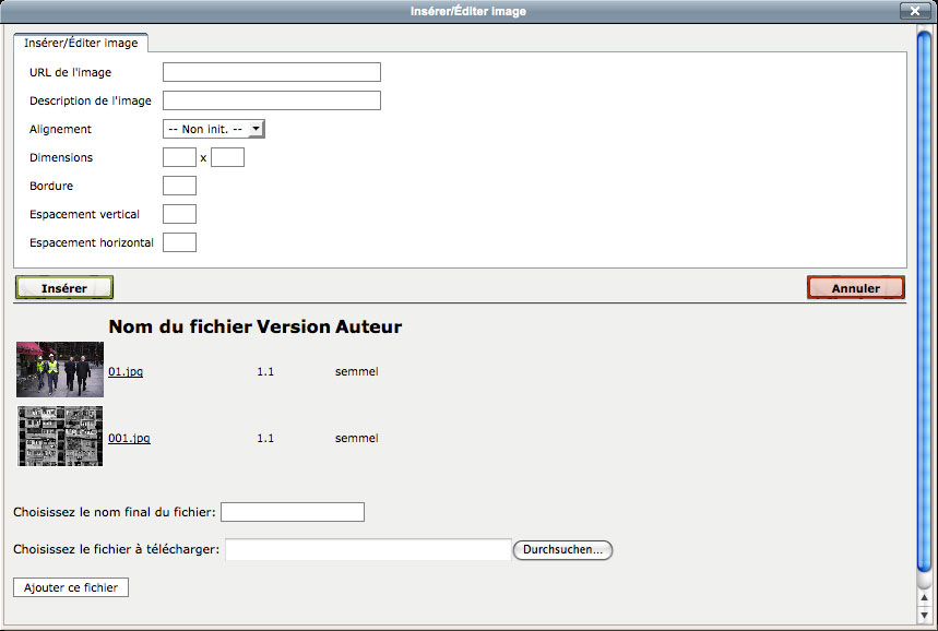 // Chosissez parmi les images éxistantes ou charger des nouveaux images. Optionellement, définissez la taille de l’image, le cadre et le texte alternatif.