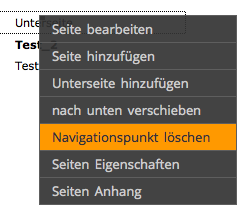 -> Der Menüpunkt/Navigationspunkt wird gelöscht, die Seite ist jedoch noch nicht gelöscht und kann über die Sitemap (oben