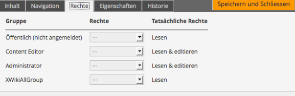 // Standardmässig haben alle Gruppen Leserechte. Die Administratorengruppe hat immer alle Rechte, dies können Sie nicht verändern. Der Gruppe Öffentlich (nicht angemeldet) können Sie nicht die Rechte Lesen & editieren geben.