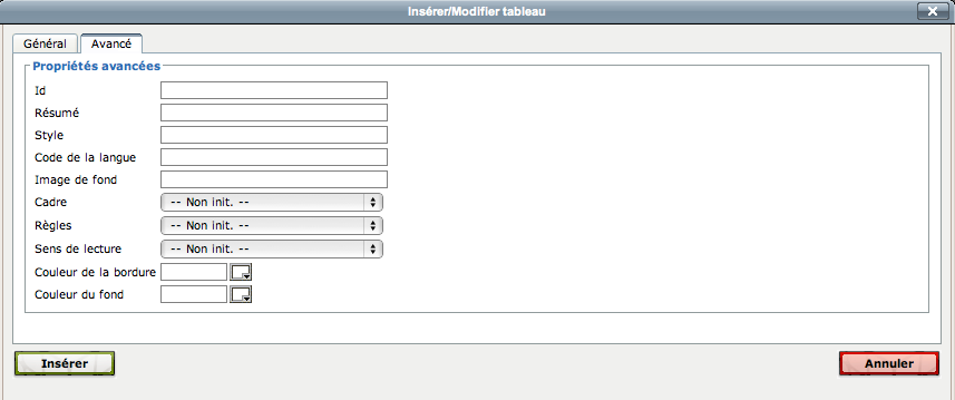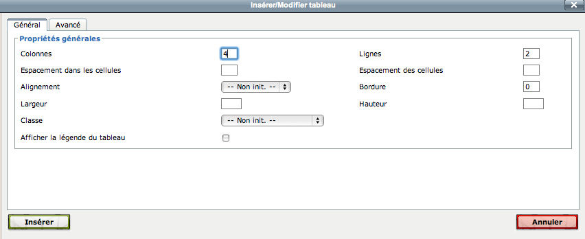 // Si toutes les propriétés du tableau sont défini, le tableau est créé avec un clic sur INSÉRER: