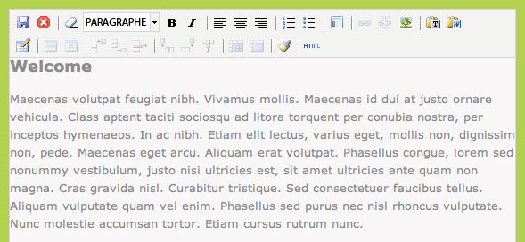 L‘élément le plus important que vous utiliserez principalement pour modifier le contenu est le Rich-Content-Editor. Les textes sont modifiables d‘une façon semblables à un logiciel de traitement de texte (comme p.e. word).