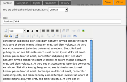 In this editor you can edit the content in a similar way as in a text processing program (such as Word). The individual symbols are set out in the TEXT EDITOR section. If you change the editing language or navigate away from the editor page and you have unsaved changes the editor will warn you that the unsaved changes get lost if you proceed.