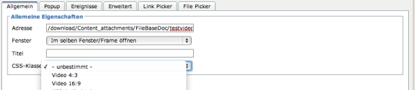 // Im Feld "Klasse" auswählen, um welchen Videotyp es sich handelt. (Externes Video z.B. von Youtube oder SF, oder ein eigenes, hochgeladenes Video mit Format 4:3 oder 16:9)