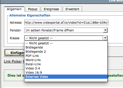 // Im Feld Klasse auswählen um was für ein Video es sich handelt. (Externes Video von Youtube oder SF oder ein eigenes, hochgeladenes Video)